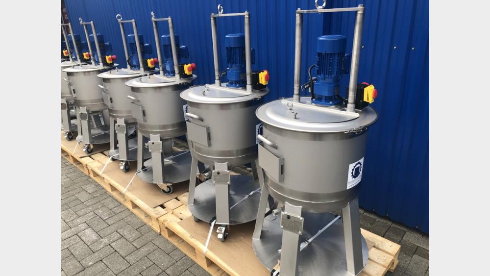 Edelstahlbehälter auf Rollen mit und ohne Rührwerk Typ COR und SCL, modifizierbar für viele Anwendungen. Propellerrührer: Homogenisieren und Mischen von niedrigviskosen Produkten Dissolver: Dispergieren und Mahlen von Produkten, Agglomerate und Pulver lösen Becherrührer: Schonendes Homogenisieren ohne Lufteintrag, auch für viskosere Produkte Balkenrührer: Homogenisieren und Mischen von niedrig- bis mittelviskosen Produkten