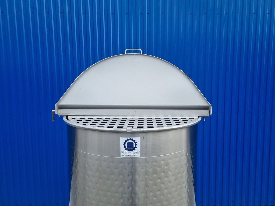Extras | Klappdeckel, mittige Traverse mit zwei Klappdeckelhälften, Edelstahl Blechrosten unterhalb des Klappdeckels als Eingreifschutz (herausnehmbar), Rastfunktion, Thermoplate H=900mm um den zyl. Teil des Behälters, Betriebsdruck max. +3Bar, Ein-/Auslauf 3/4" Nippel, 1x DN50 DIN11851 Stutzen mit Blindkappe auf dem Oberboden |