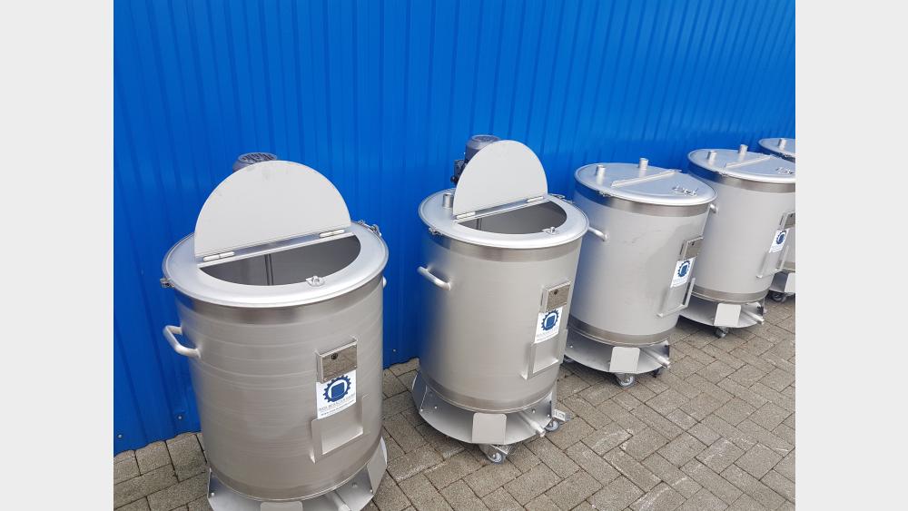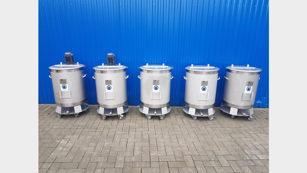 Mobile, elektrisch beheizte Behälter mit und Rührwerk auf Rollen. >Weitere Informationen Rührwerksbehälter < >Weitere Informationen Lagerbehälter < Die Aufheizung erfolgt über ein Wärmeträgermedium im Doppelmantel, welches elektrisch aufgeheizt wird. Durch die indirekt Beheizung des Innenbehälters brennt nichts an, es wird am Zylinder und Boden erhitzt.