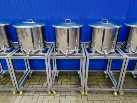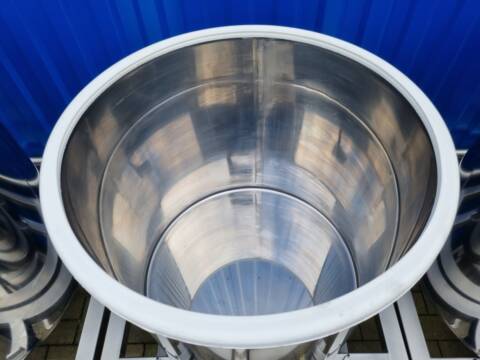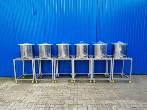 6x 100L BOP100 Edelstahlbehälter mit Spannringdeckel und Rollwägen für Chemie 6x 100L BOP100 Edelstahlbehälter mit Spannringdeckel und Rollwägen für Chemie